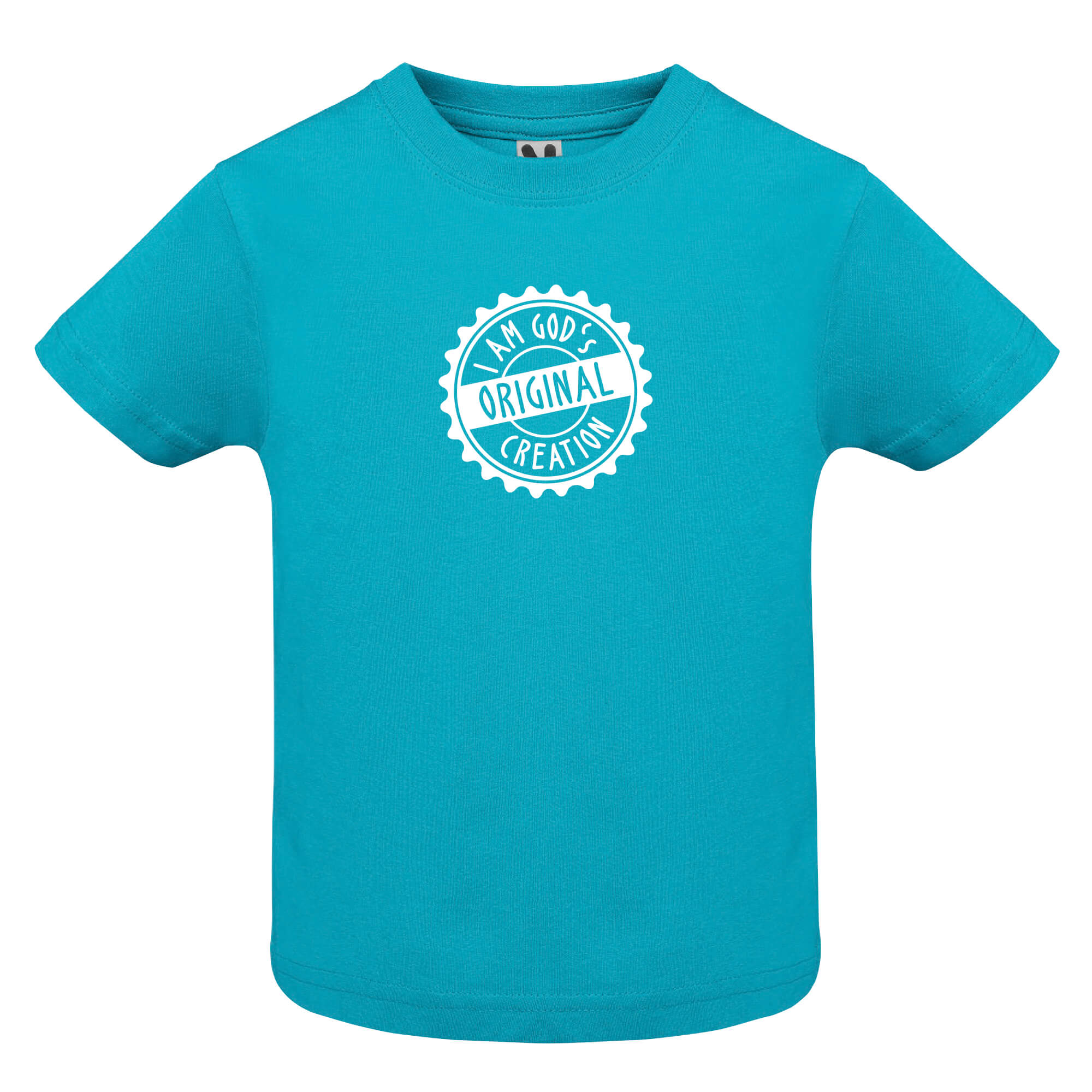 Baby-Shirt mit Aufdruck „I am God‘s Original Creation“, Gr. 68-73 (ca. 6 Monate, Breite unterhalb der Ärmel gemessen: ca. 24 cm), aus 100% gekämmter Baumwolle, Single Jersey, 160 g/m² Halsbündchen aus Rippstrick, zwei Druckknopf- Verschlüsse an der linken Schulter, waschbar bei 40 °C