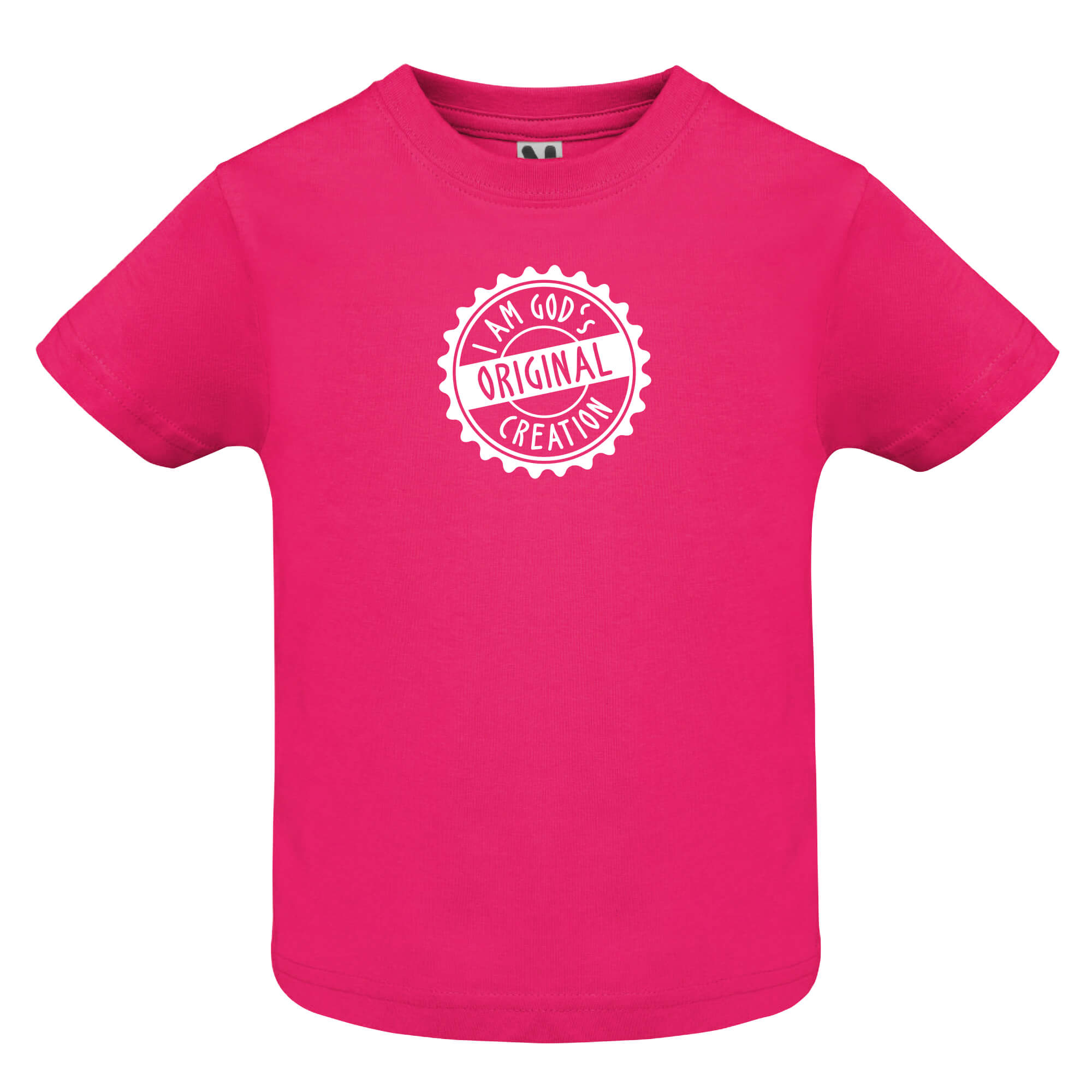 Baby-Shirt mit Aufdruck „I am God‘s Original Creation“, Gr. 86-91 (ca. 18 Monate, Breite unterhalb der Ärmel gemessen: ca. 27 cm), aus 100% gekämmter Baumwolle, Single Jersey, 160 g/m² Halsbündchen aus Rippstrick, zwei Druckknopf- Verschlüsse an der linken Schulter, waschbar bei 40 °C