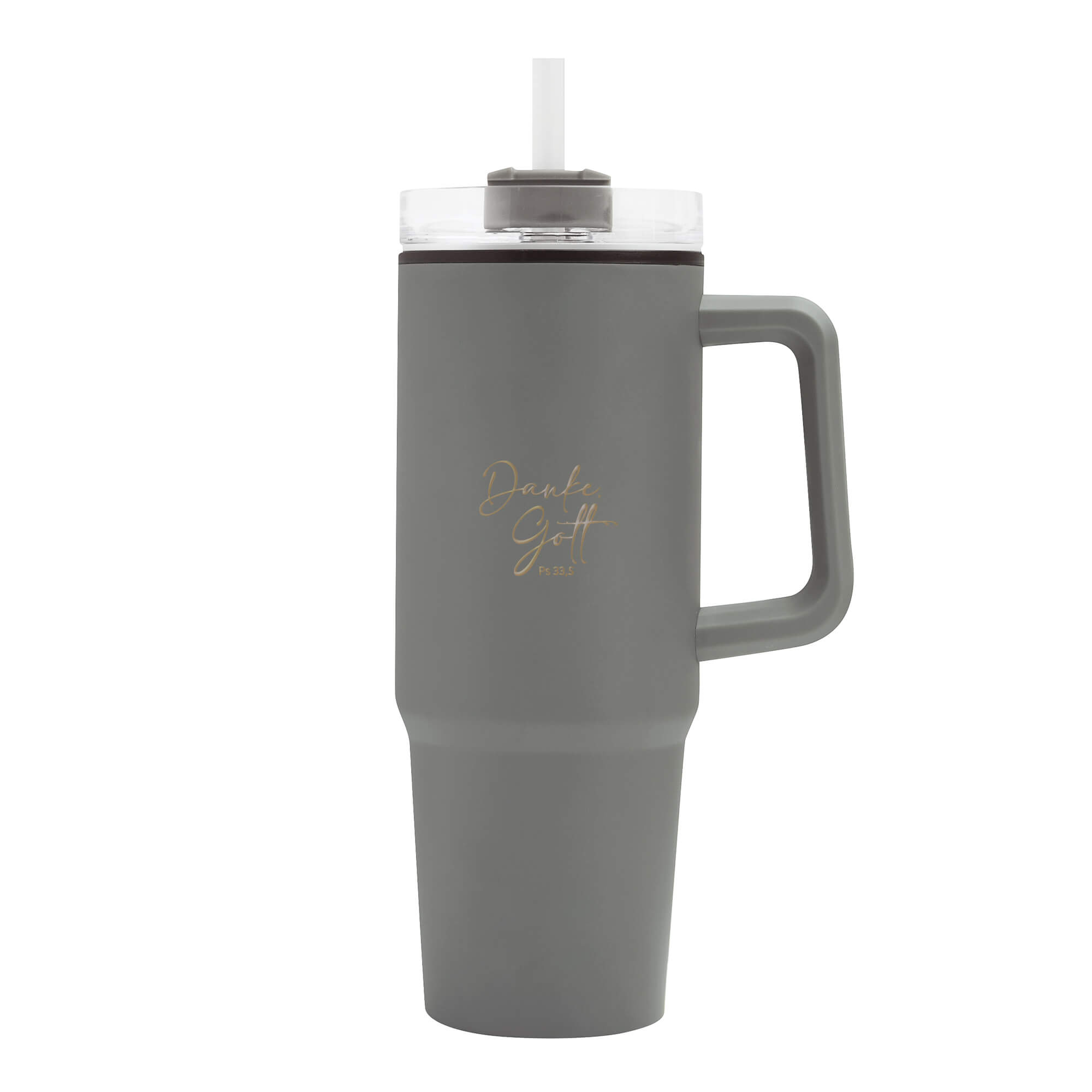 Veredelt ist der Becher mit einer Lasergravur und den Worten „Danke Gott Ps 33,5“.