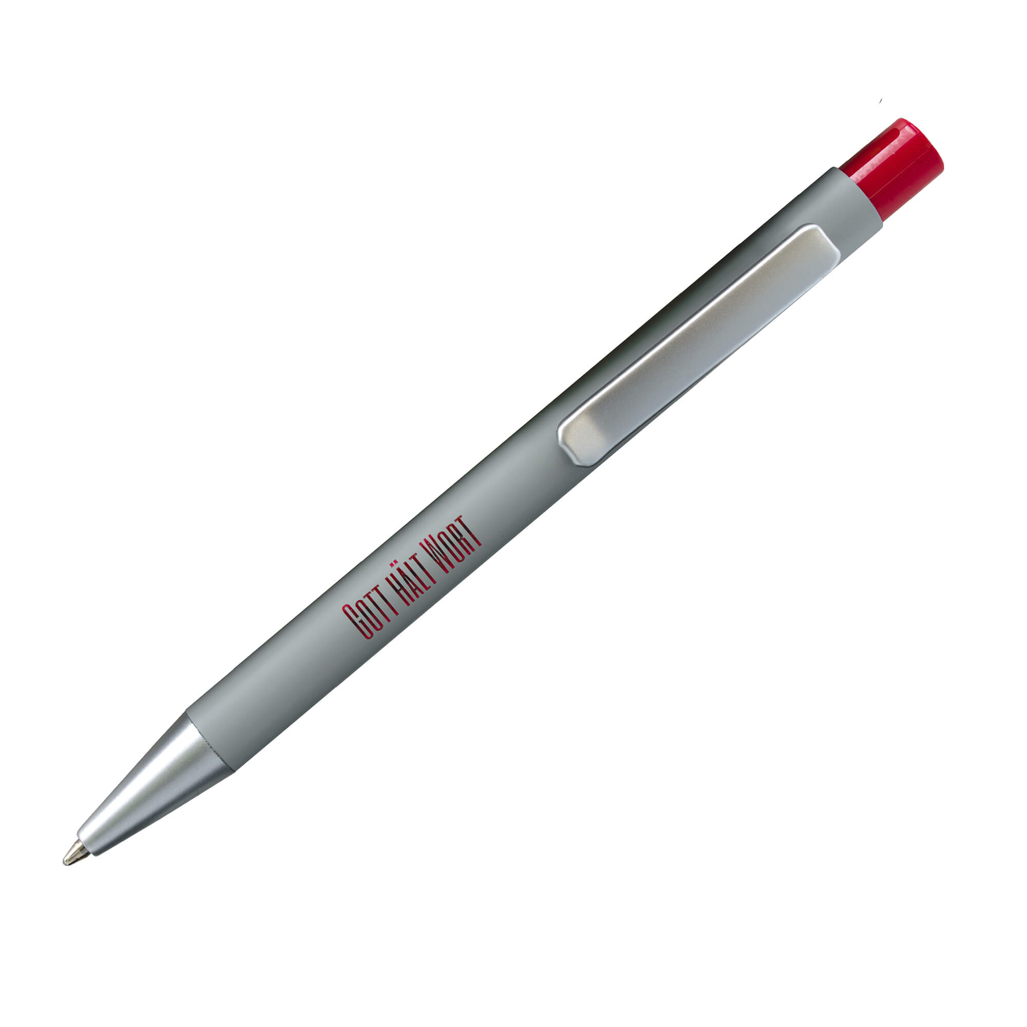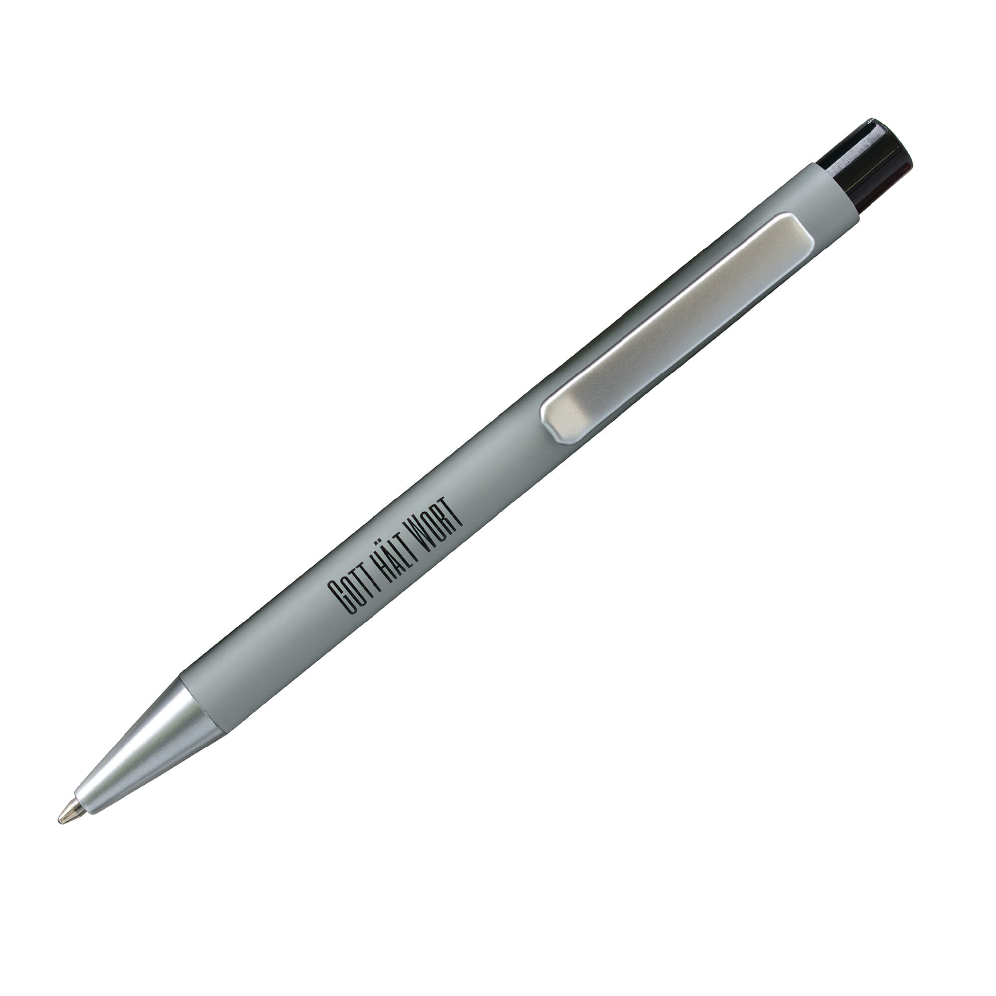 Glänzend in Szene gesetzt wird der Vers „Gott hält Wort“ dank der farbigen Unterlegung. Das sorgt für eine effektvolle Gravur. Mit jeweils farblich dazu passendem Drücker.