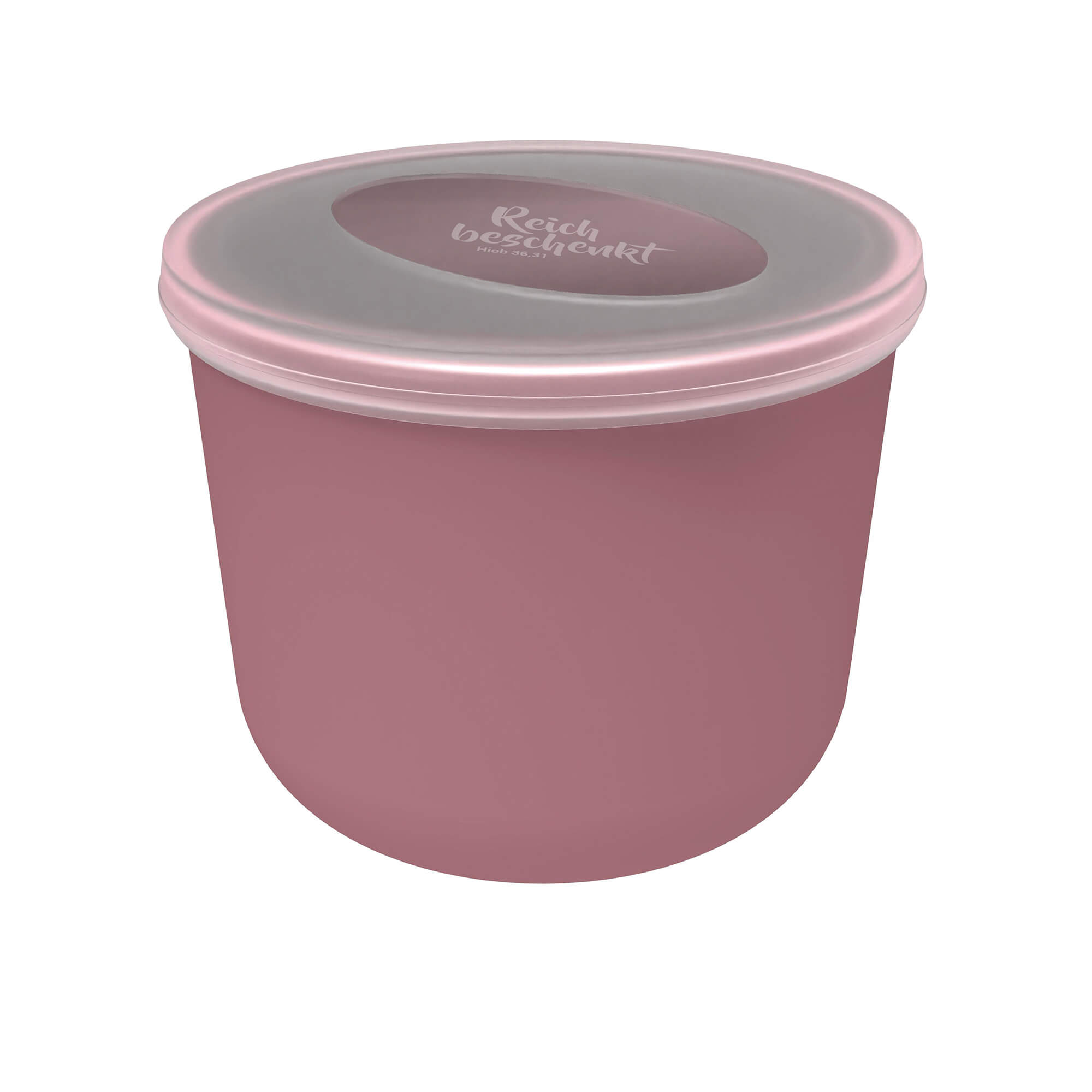 Graviert ist er auf dem transparenten Sichtfenster des fest schließendem Deckels mit dem Vers „Reich beschenkt Hiob 36,31“.
