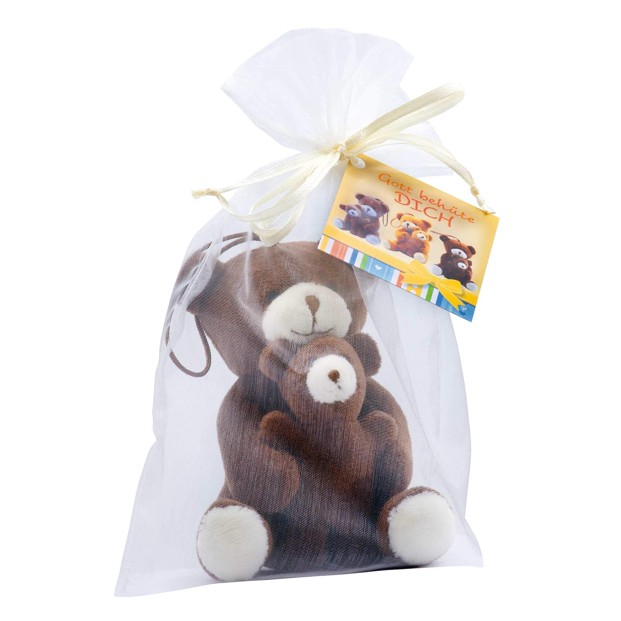 Der große Teddy hält liebevoll den kleinen Bären im Arm, begleitet von der Botschaft „Gott behüte DICH“ auf dem Schmuckkärtchen.
