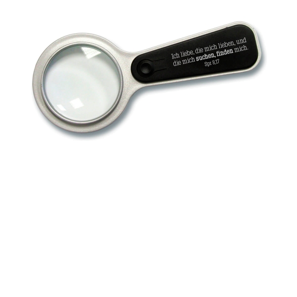 „Ich liebe, die mich lieben, und die mich suchen, finden mich. Spr 8,17“, 15 cm, Kunststoff, in Schachtel, praktischer Alltagshelfer, vergrößert 5-fach, mit Licht (Rückseite mit LED-Lampe), inkl. Batterie, auswechselbar.