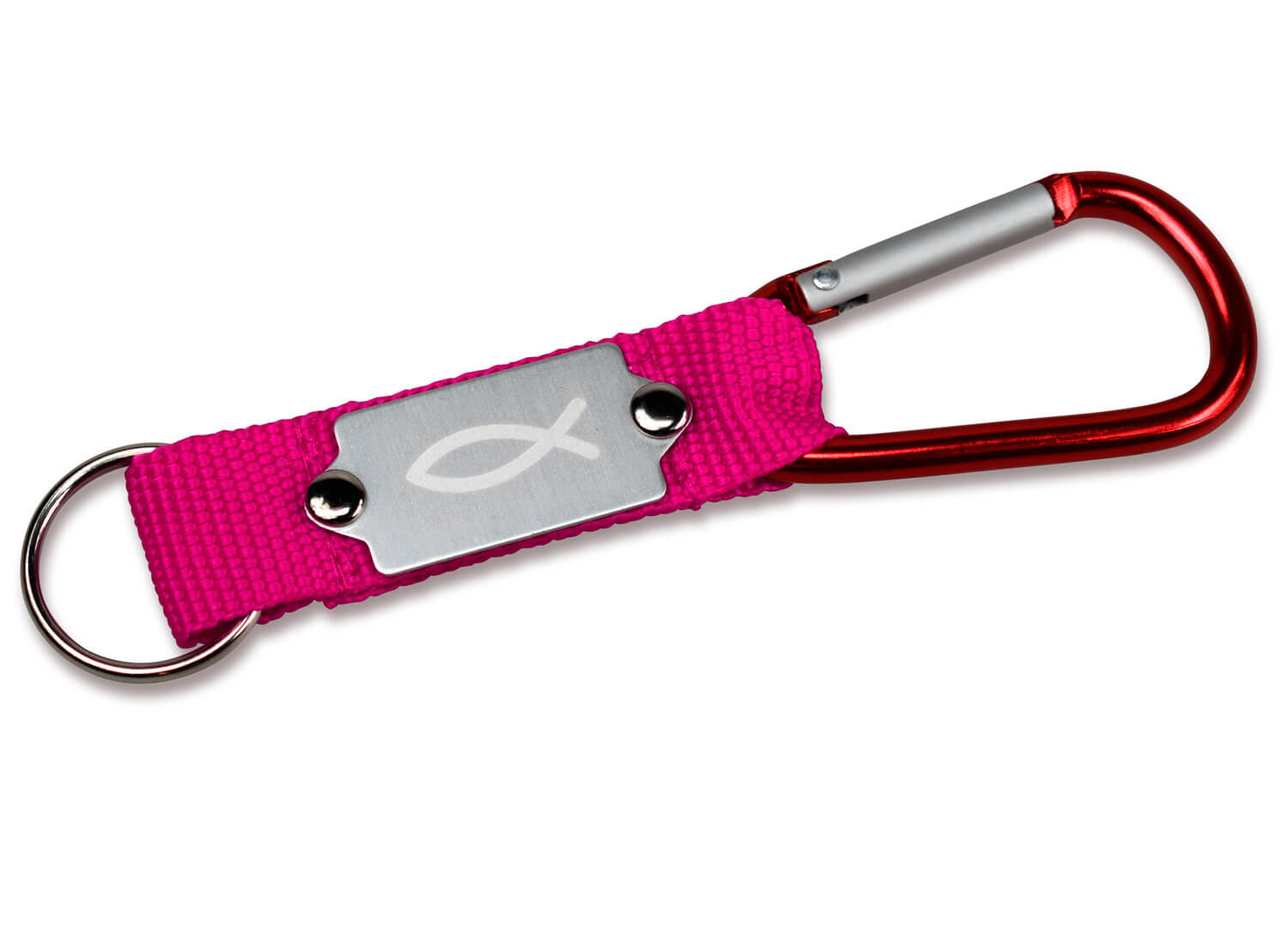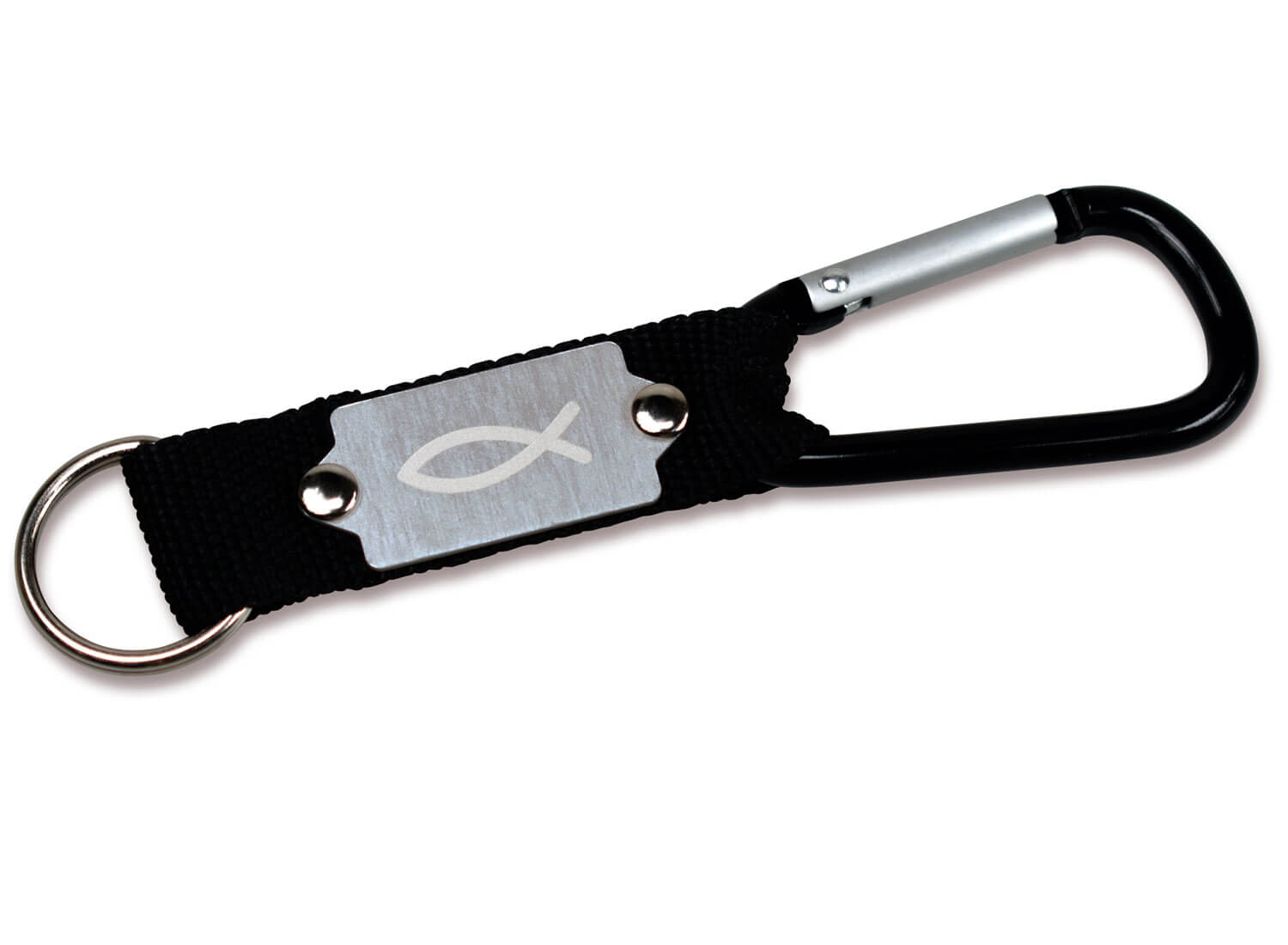 Schlüsselanhänger mit Karabiner. Verbunden ist der Schlüsselring durch ein Nylonband mit dem Karabinerhaken. Auf dem Nylonband befindet sich eine Metallplakette, weclher mit dem Ichthys-Symbol graviert ist. Länge ca. 11,5cm.