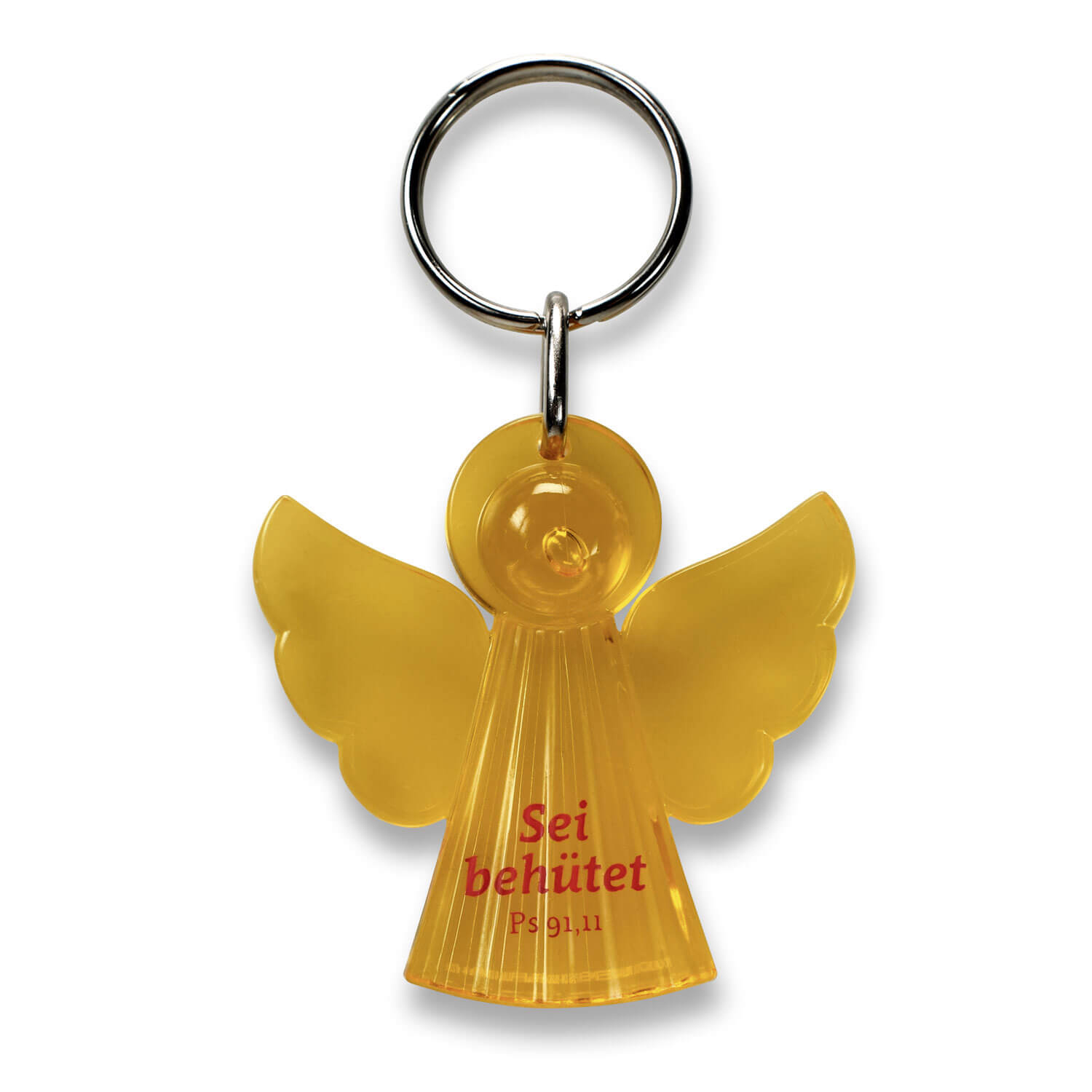Schlüsselanhänger „Engel“ aus transparentem Acryl, bedruckt mit „Sei behütet Ps 91,11“. Größe ca. 5 cm